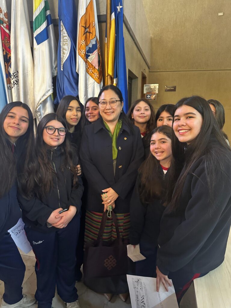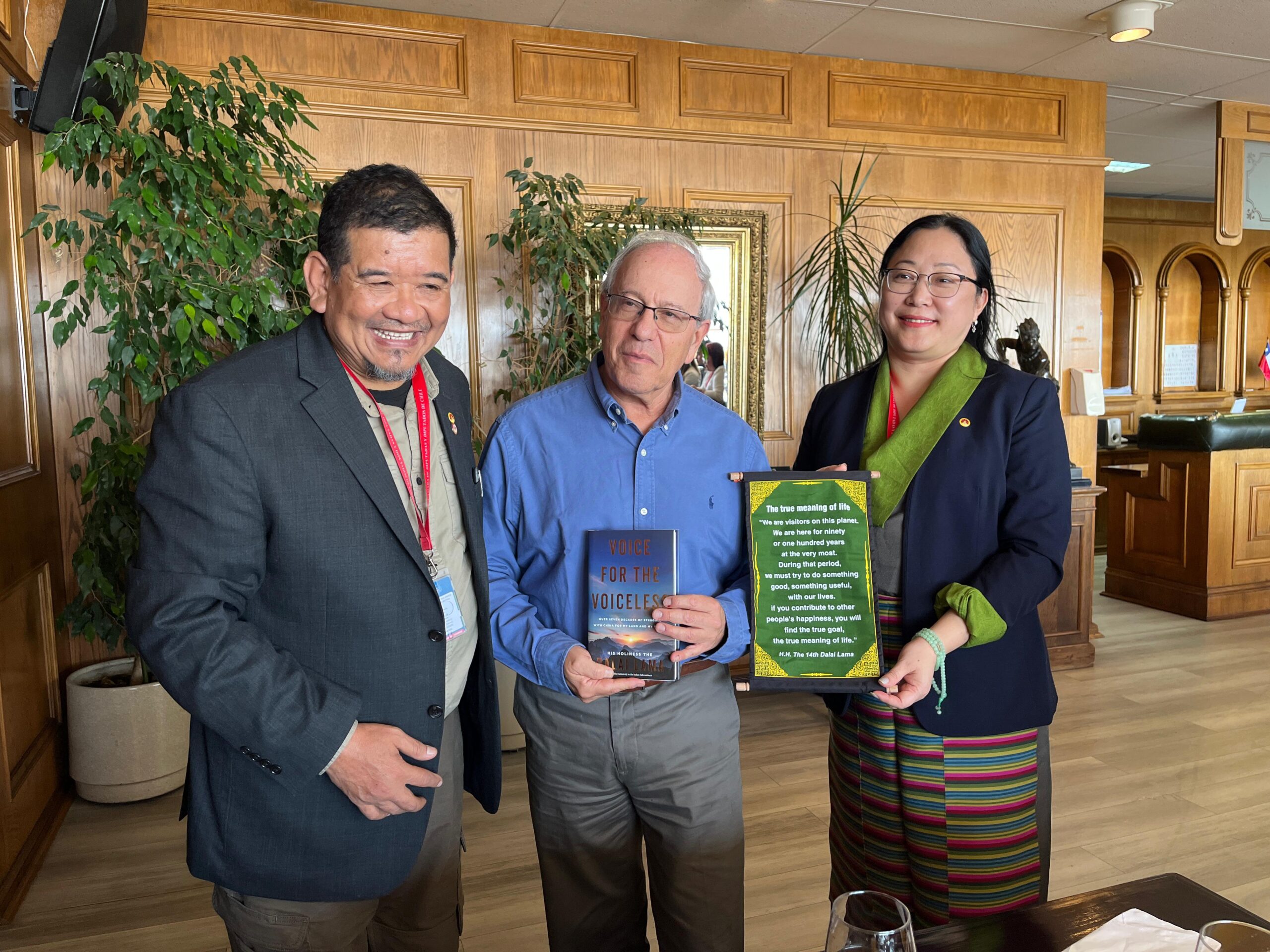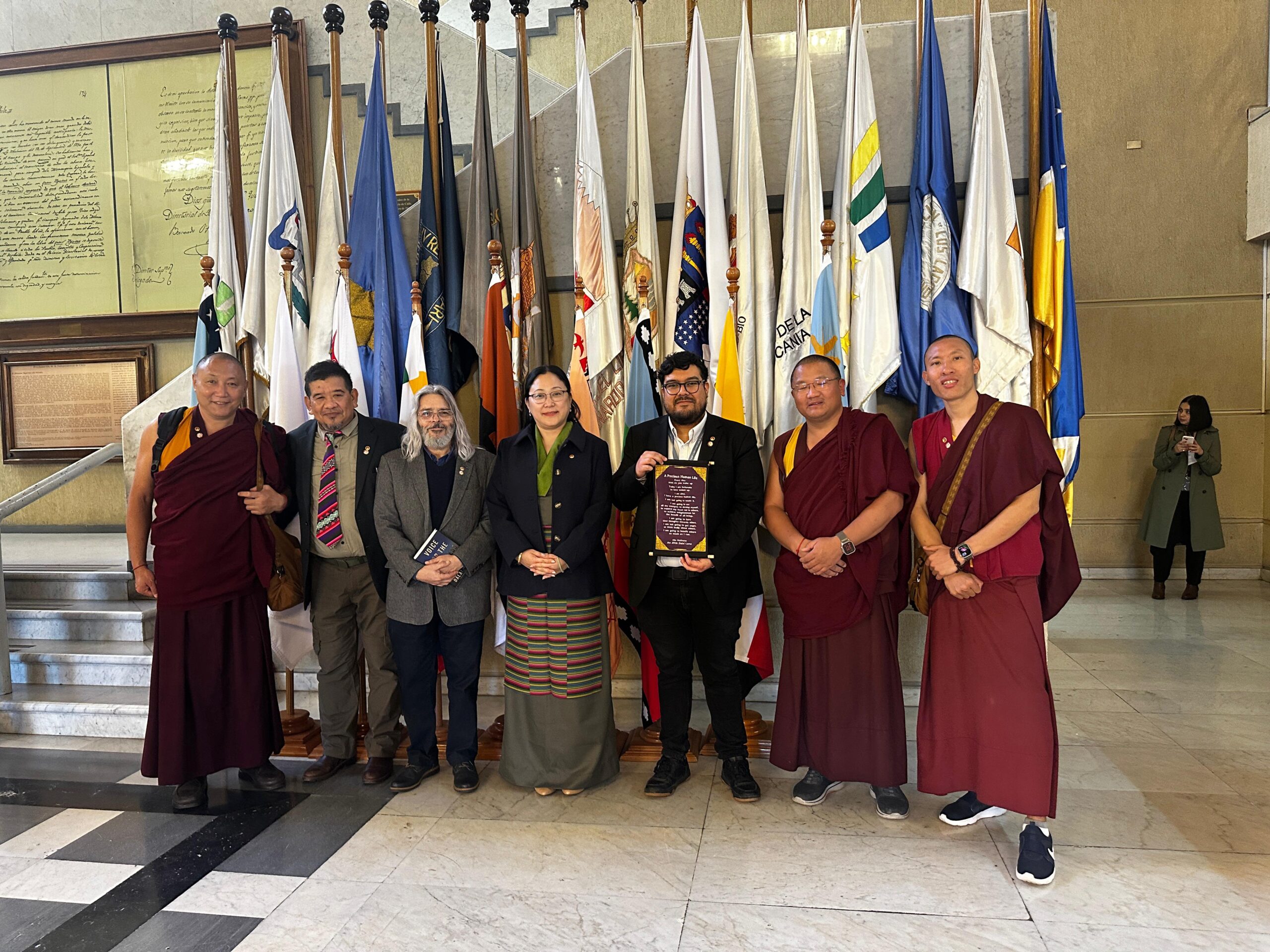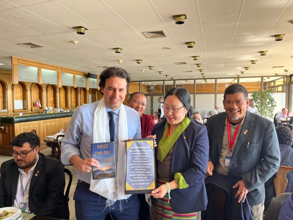 En un almuerzo de trabajo realizado en la terraza del edificio del Parlamento, la ministra se reunió con los diputados Vlado Mirosevic, Tomás Hirsch, Ana María Gazmuri, Luis Malla Valenzuela, entre otros, así como con Fernando Salinas, presidente de la ONG Amigos del Tíbet, Chile. Norzin Dolma agradeció el apoyo de los parlamentarios, ofreció un informe sobre la situación actual en el Tíbet, en particular sobre la cuestión de la reencarnación de Su Santidad el Dalái Lama y la importancia de la conciencia y responsabilidad internacional. Obsequió a cada invitado con un broche conmemorativo de los 90 años, el libro “Voice for the Voiceless” (Voz para los Sin Voz) y un pergamino con citas de Su Santidad.